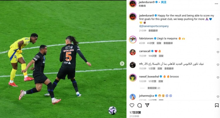 他也在賽后通過(guò)社媒曬出自己的比賽照,并配文:“對(duì)勝利感到高興,也很開心能夠?yàn)檫@家的偉大俱樂(lè)部打進(jìn)我的處子球,我們會(huì)繼續(xù)努力爭(zhēng)取贏得更多。”