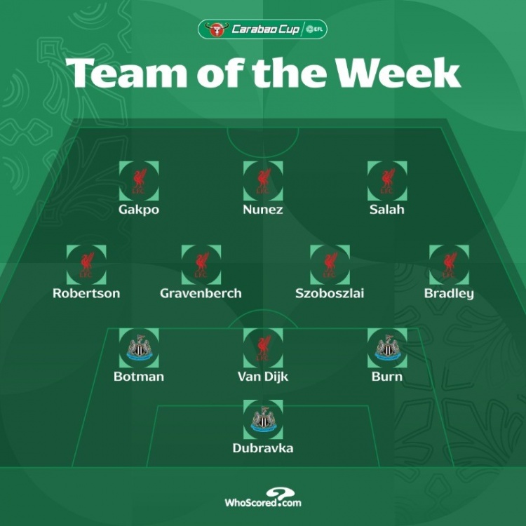 2月8日訊 聯(lián)賽杯半決賽次回合已經(jīng)完賽,紐卡2-0雙殺阿森納、利物浦4-0逆轉(zhuǎn)淘汰熱刺。聯(lián)賽杯官方也評出了本周最佳陣容。