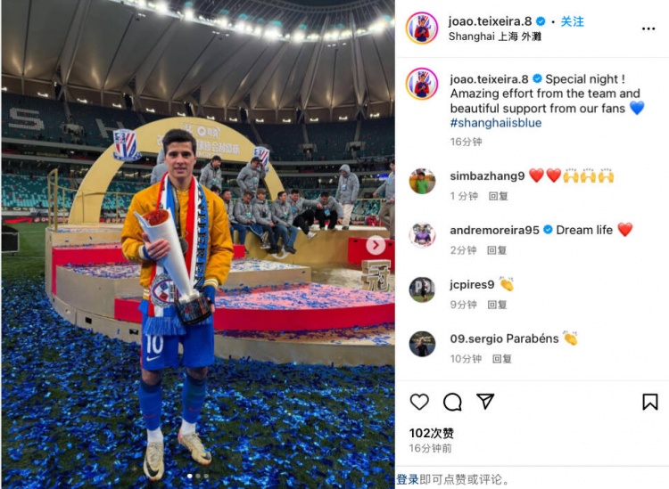 賽后申花外援特謝拉曬出捧杯照慶祝奪冠,他為照片配文寫(xiě)道:“一個(gè)有著特別意義的夜晚!這場(chǎng)比賽我們的努力是如此巨大,還有球迷們的熱情支持,多么美妙!”