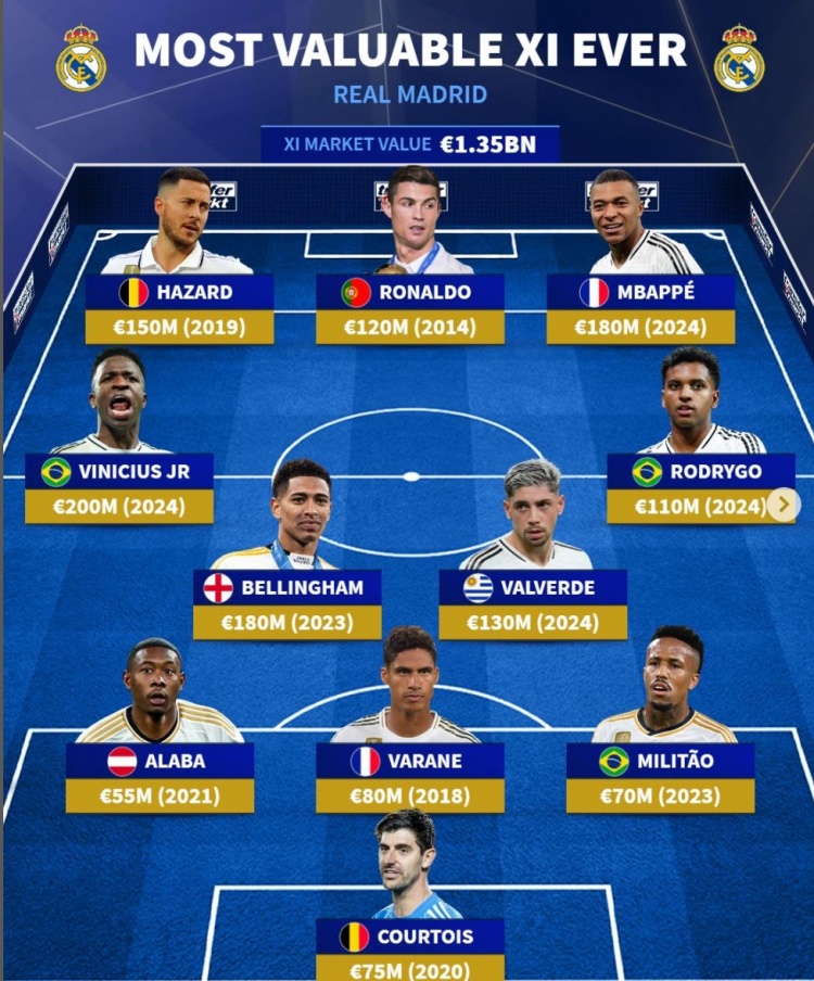 德轉(zhuǎn)列皇馬隊(duì)史身價最貴陣:總身價13.5億歐元