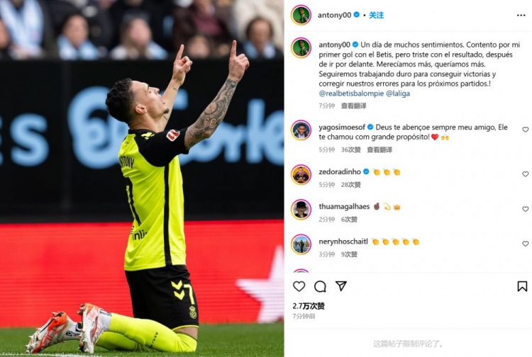 他也在賽后通過社媒曬出自己慶祝進(jìn)球的照片,并配文:“情緒復(fù)雜的一天!為我打進(jìn)貝蒂斯生涯處子球感到高興,但也為領(lǐng)先后被翻盤而難過?!?/p>