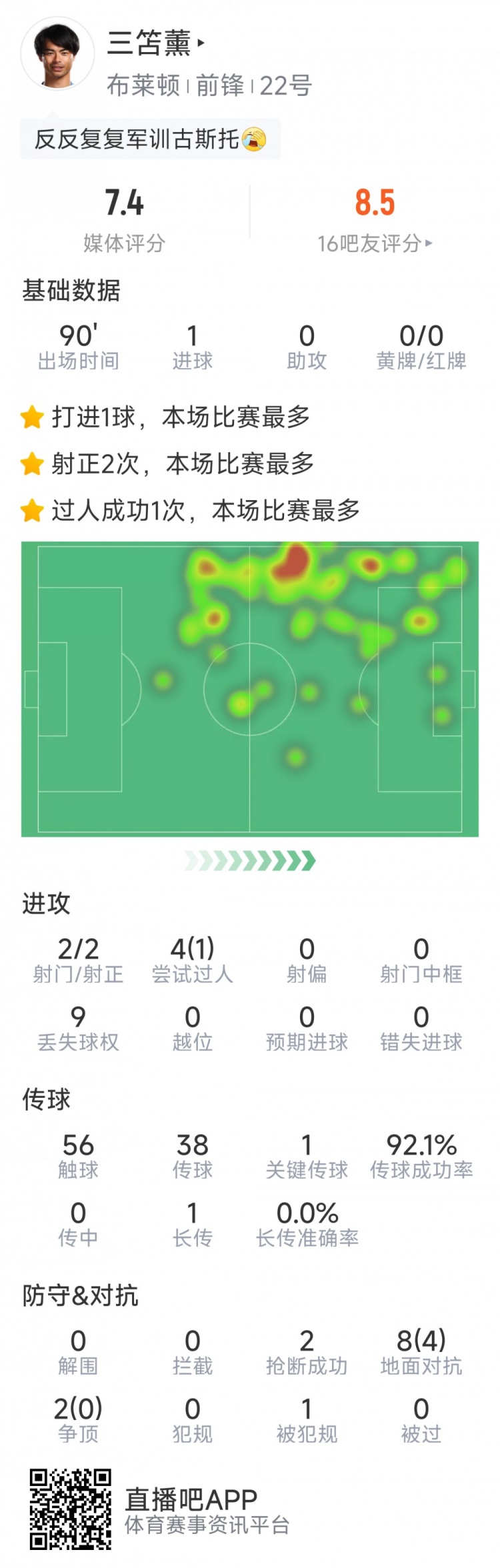 2月9日訊 在本輪足總杯,布萊頓2-1擊敗切爾西,三笘薫打進(jìn)一球,以下為他在本場數(shù)據(jù):