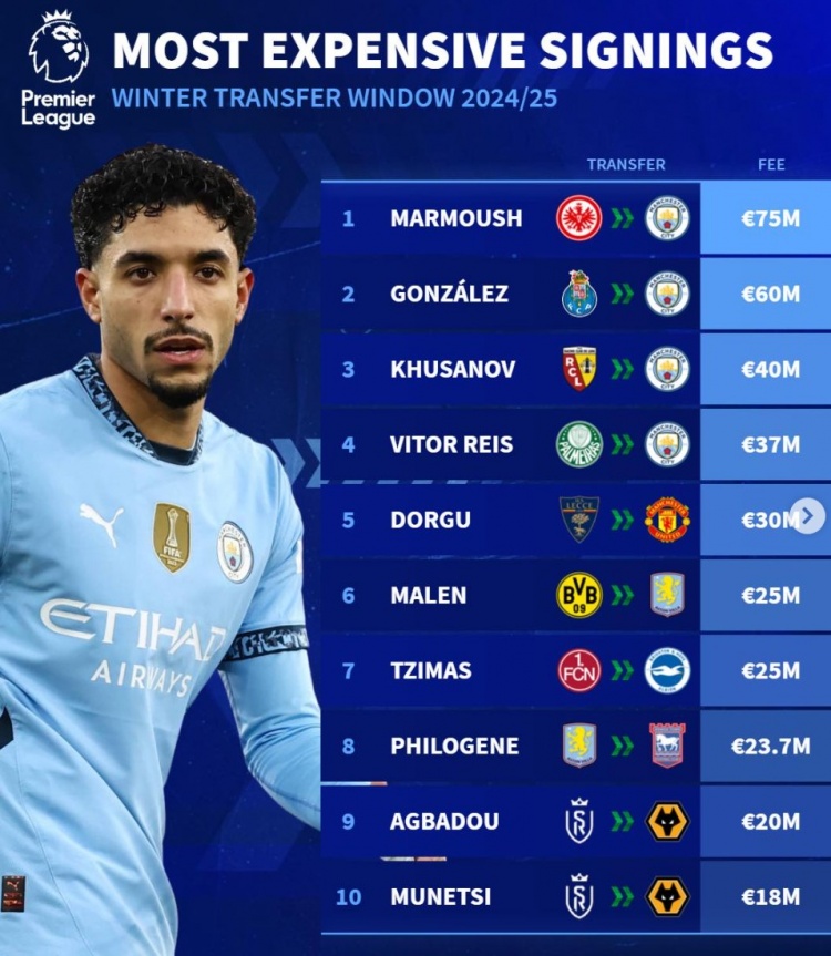 2月10日訊 五大聯(lián)賽冬窗已經關閉,《轉會市場》也統(tǒng)計了本賽季英超冬窗最貴轉會榜,曼城獨占前四。