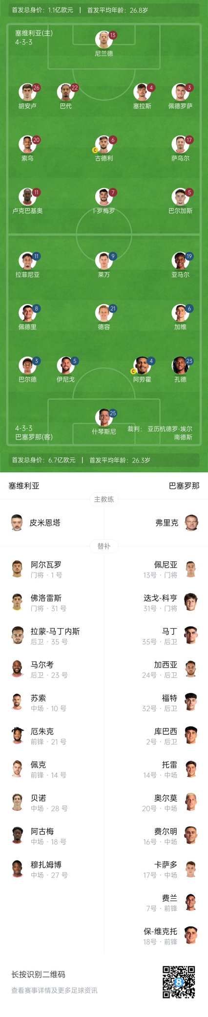 塞維利亞替補:1-阿爾瓦羅-費爾南德斯、31-弗洛雷斯、35-拉蒙-馬丁內斯、23-馬爾康、18-阿古梅、27-穆扎姆博、28-貝諾、10-蘇索、14-佩克-費爾南德斯、21-厄朱克、