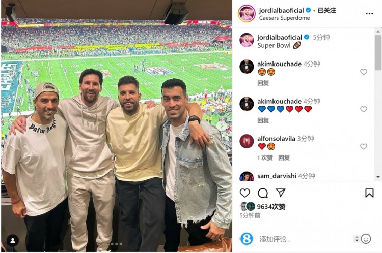 2月10日訊 阿爾巴更新社媒動態(tài),曬出與梅西等隊友現(xiàn)場觀看超級碗的合照。