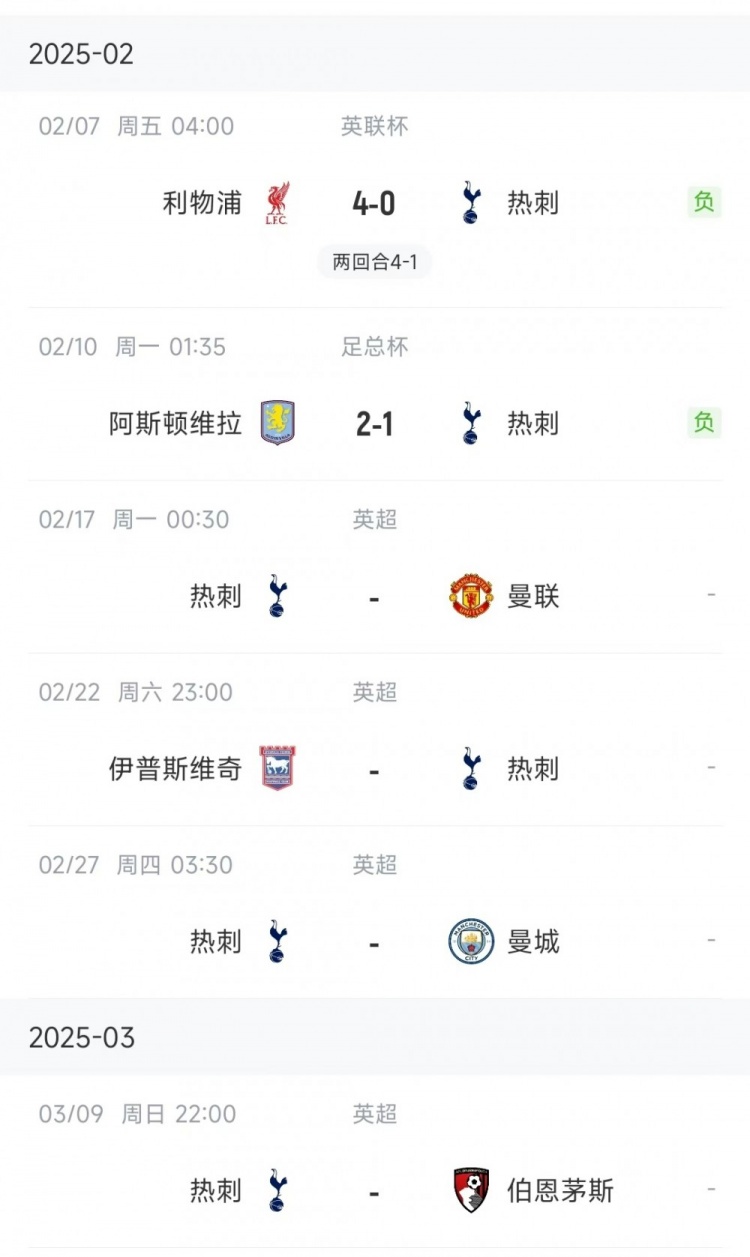 聯(lián)賽方面,熱刺目前8勝3平13負(fù)積27分,排在第14位。接下來4輪比賽,熱刺將對陣曼聯(lián)、伊普斯維奇、曼城、伯恩茅斯。