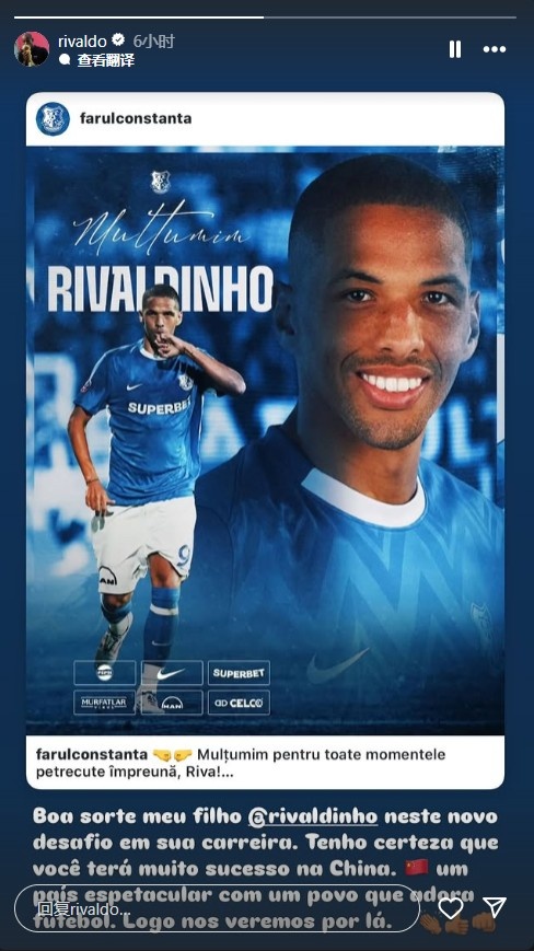 在個人社媒,里瓦爾多曬出里瓦爾迪尼奧加盟青島紅獅的官方照,同時配文:“祝我的兒子在職業(yè)生涯的新挑戰(zhàn)中好運,我相信你在中國一定會成功,中國是一個有著熱愛足球的人民的國家,很快就會見面?!?/p>