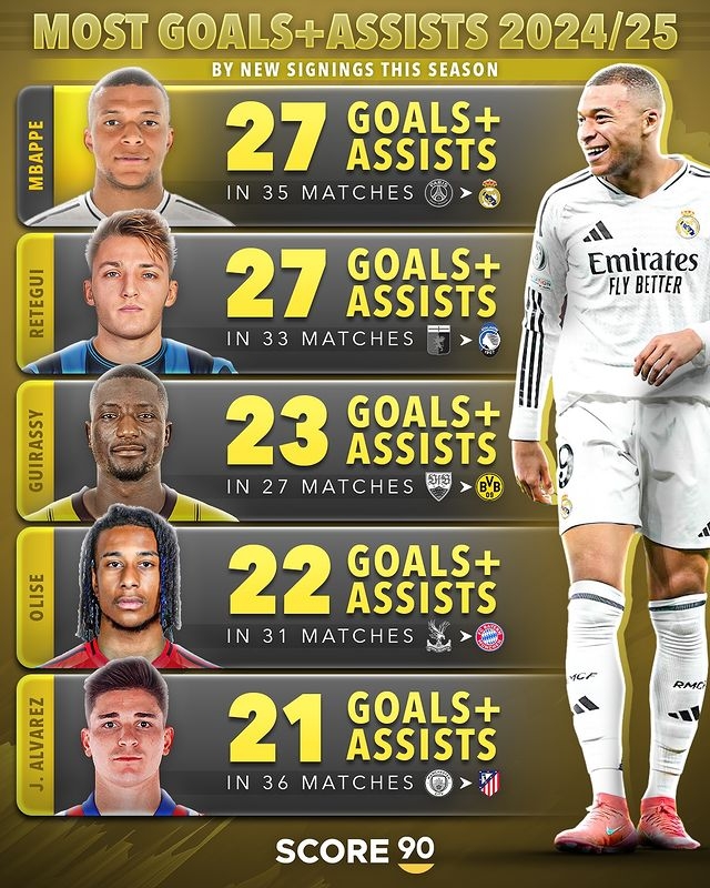 本賽季新援直接參與進球(進球+助攻)排行