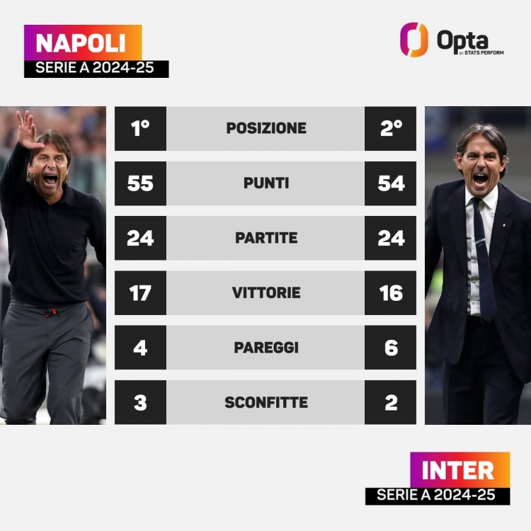 據(jù)Opta統(tǒng)計,那不勒斯和國米在意甲24輪比賽后僅相差1分,意甲三分制時代第2次出現(xiàn)這樣的情況,首次是在2011-2012賽季(那不勒斯37分、國米36分)。