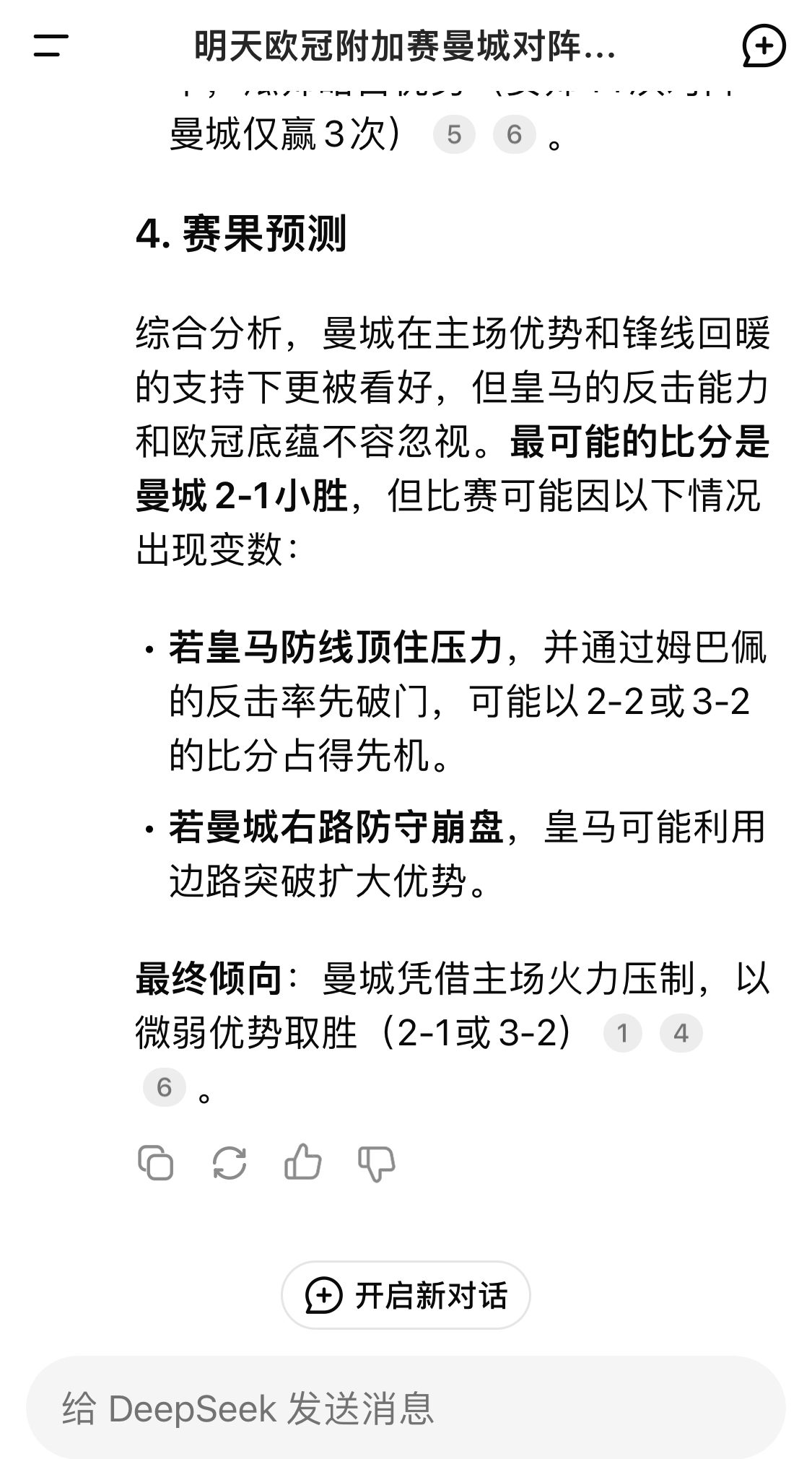 DeepSeek預(yù)測(cè):曼城以微弱優(yōu)勢(shì)取勝,最可能的比分是曼城2-1皇馬
