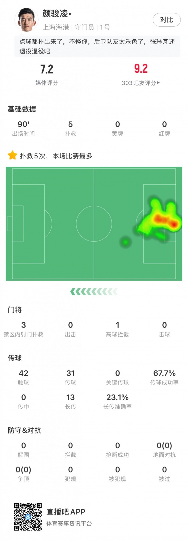 全場比賽顏駿凌貢獻數(shù)次撲救,還將大迫勇也的點球拒之門外,但仍無力幫助球隊扭轉頹勢,賽后他獲得隊內(nèi)最高的7.2分。