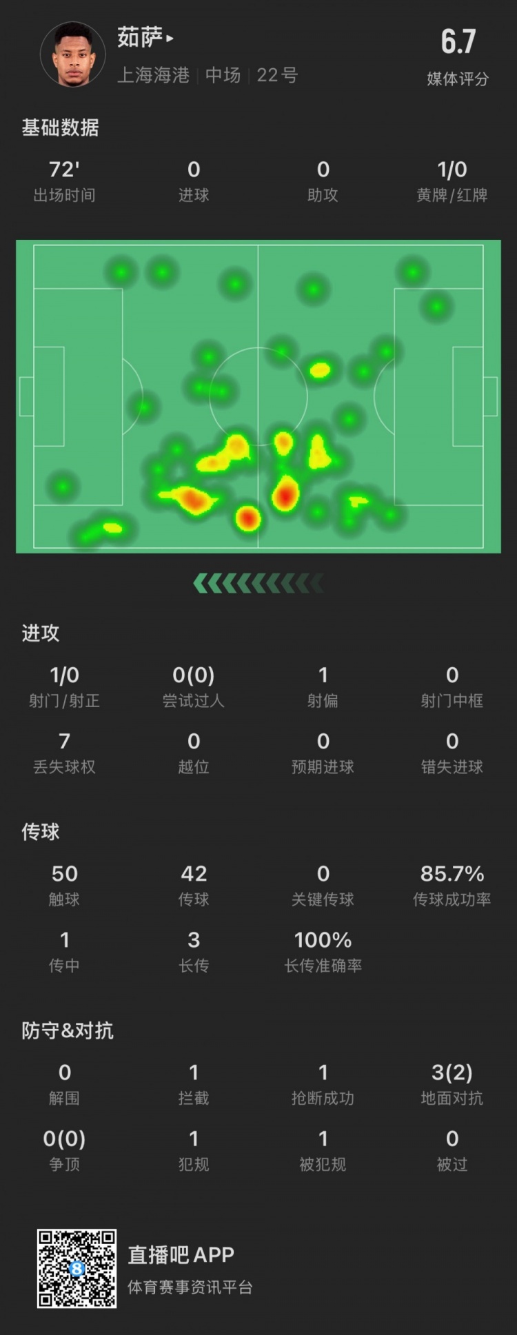 本場(chǎng)比賽巴西外援茹薩為海港首發(fā)出戰(zhàn),在比賽第72分鐘時(shí)被換下,但未能幫助海港扭轉(zhuǎn)不利局面,最終他獲得6.7分的全場(chǎng)評(píng)分。