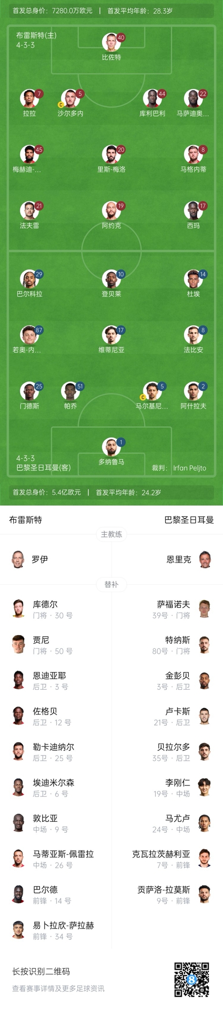 布雷斯特首發(fā):40-比佐特、5-沙爾多內(nèi)、20-里斯-梅洛、22-海達(dá)拉44-索瑪拉-庫(kù)利巴利、8-馬格內(nèi)蒂、21-法夫雷、45-馬赫迪-卡馬拉、17-西瑪、7-拉拉、19-阿約克