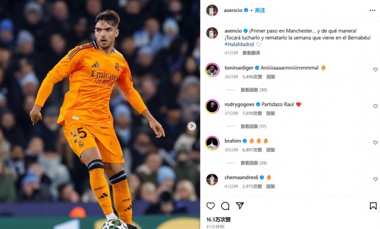 因傷缺席的皇馬中衛(wèi)呂迪格也現(xiàn)身評(píng)論區(qū),并以搞怪方式送上鼓勵(lì):“Aniiiiiaaaannniiiimmmmal????”,可能是用英語(yǔ)形容勞爾-阿森西奧的表現(xiàn)堪稱(chēng)野獸(animal)。