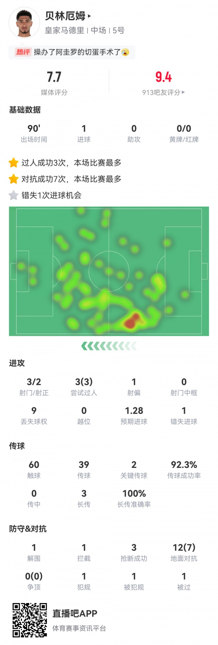 2月12日訊 歐冠淘汰賽附加賽首回合,曼城主場(chǎng)2-3遭皇馬絕殺。此役絕殺功臣貝林厄姆首發(fā)打滿全場(chǎng),球員全場(chǎng)重點(diǎn)數(shù)據(jù)如下↓