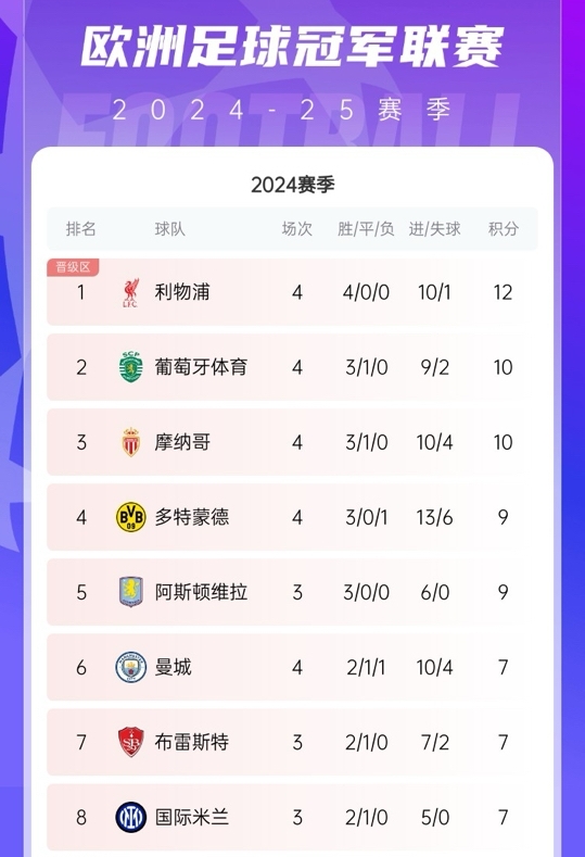 歐冠4輪后葡體位置: