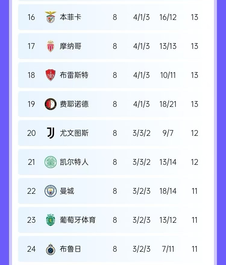 歐冠8輪后葡體位置: