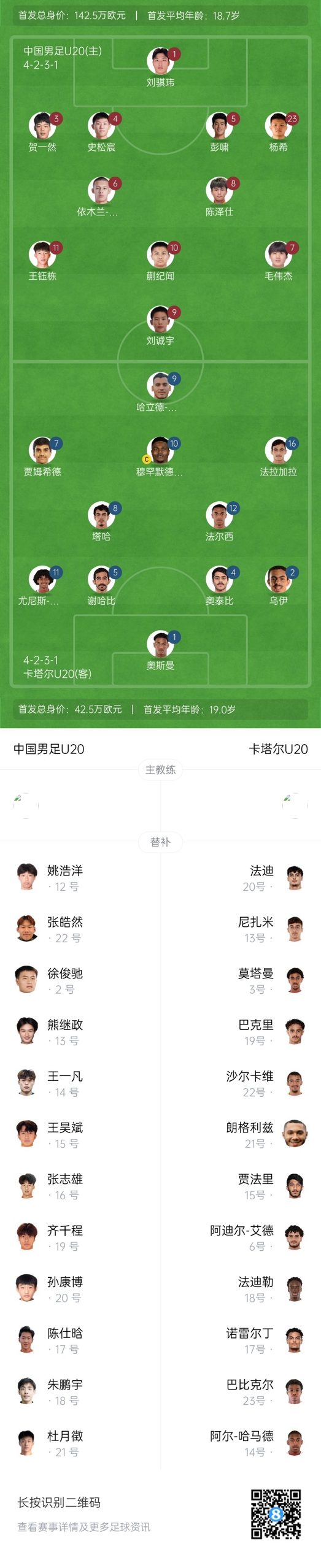 卡塔爾U20替補:21-朗格利茲、22-沙爾卡維、3-莫塔曼-穆罕默德、6-艾德、13-尼扎米、14-哈馬德、15-賈法里、17-努爾丁-易卜拉欣、18-法迪勒、19-巴克里、20-齊亞德-法迪、23-巴比克爾