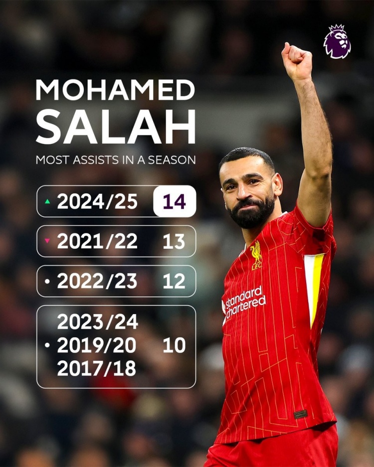 數(shù)據(jù)統(tǒng)計(jì)顯示,薩拉赫也以14次助攻打破了個(gè)人單賽季英超助攻紀(jì)錄。