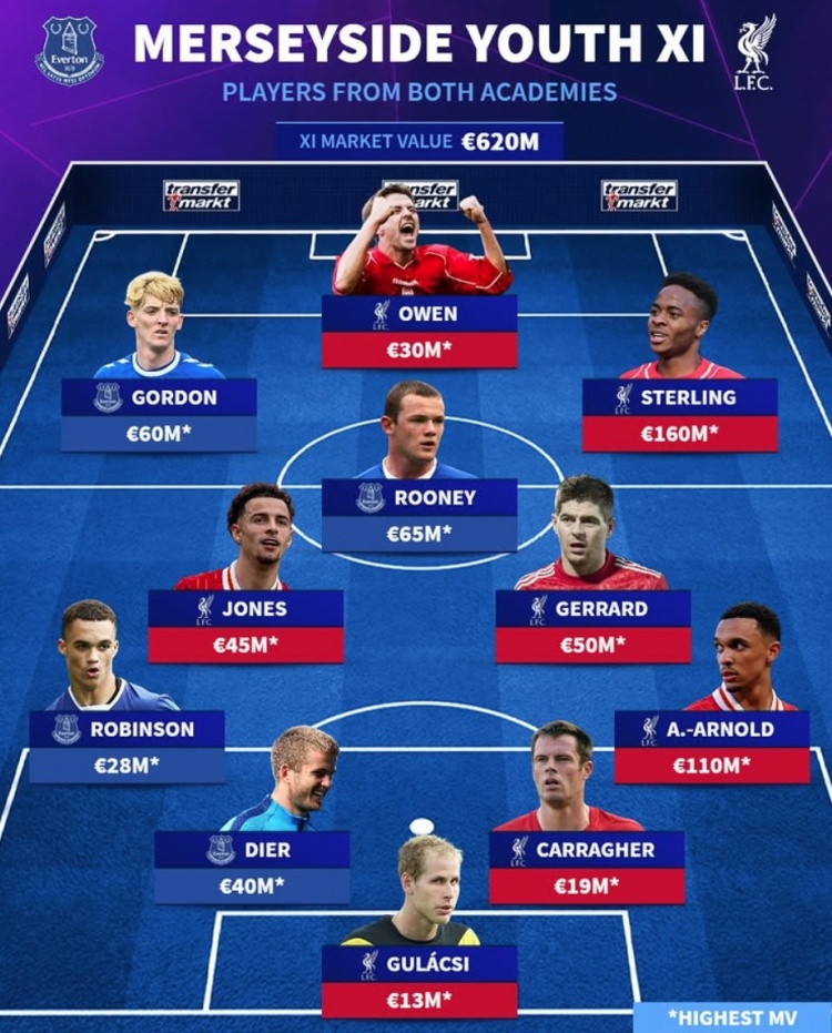 2月13日訊 利物浦將在本輪英超迎來同埃弗頓的默西賽德郡德比,《轉(zhuǎn)會市場》也列出了兩隊歷史最貴身價青訓(xùn)陣容。