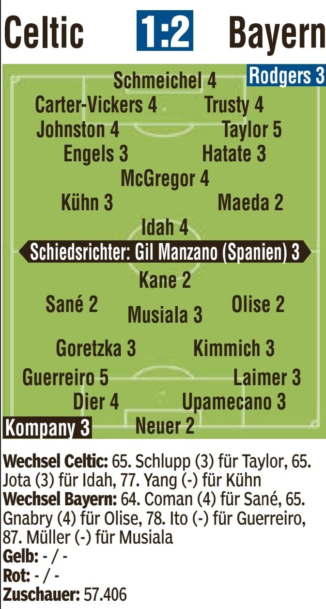 2月13日訊 歐冠淘汰賽附加賽首回合比賽,拜仁客場(chǎng)2-1擊敗凱爾特人,德國(guó)媒體《圖片報(bào)》對(duì)球員進(jìn)行了評(píng)分,凱恩、薩內(nèi)、奧利塞、諾伊爾、前田大然2分最高。