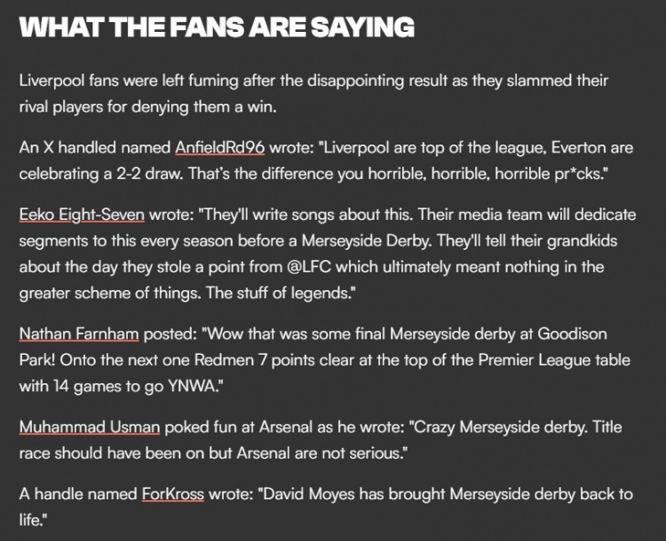 2月13日訊 英超第15輪補(bǔ)賽,利物浦客場(chǎng)2-2遭埃弗頓絕平,比賽爭(zhēng)議場(chǎng)面不斷,賽后雙方還爆發(fā)了沖突。國(guó)外一些紅軍球迷對(duì)這場(chǎng)比賽表達(dá)了看法。