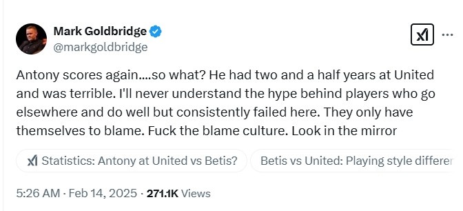 英國著名曼聯(lián)球迷頻道The United Stand的主理人Mark Goldbridge對此表示道:“安東尼又進球了...那又怎么樣?他在曼聯(lián)待了2年半時間,表現(xiàn)很糟糕。我永遠無法理解那些去其他地方表現(xiàn)很好的球員背后的炒作,不過他們總是在這里失敗。他們只能怪自己,去他*的責備文化,照照鏡子吧。”