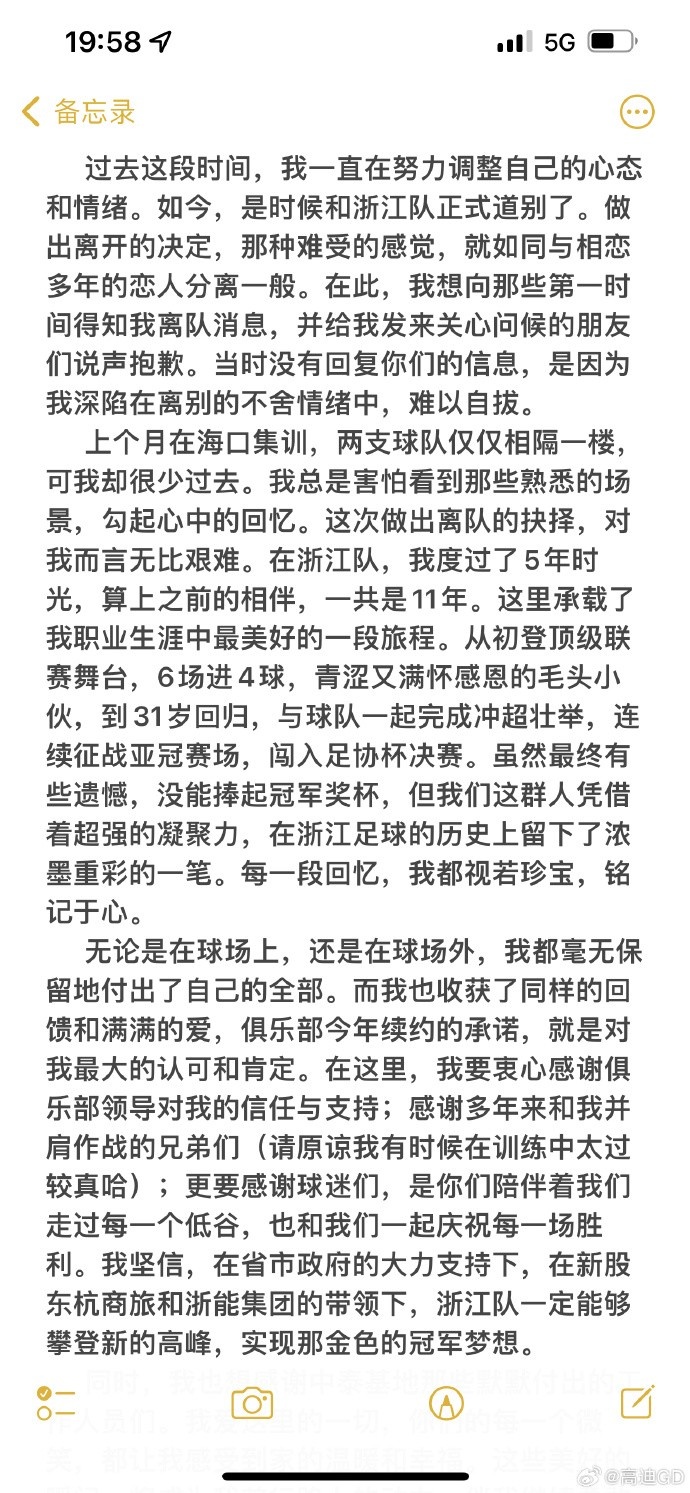 過去這段時間,我一直在努力調(diào)整自己的心態(tài)和情緒。如今,是時候和浙江隊正式道別了。做出離開的決定,那種難受的感覺,就如同與相戀多年的戀人分離一般。在此,我想向那些第一時間得知我離隊消息,并給我發(fā)來關(guān)心問候的朋友們說聲抱歉。當時沒有回復你們的信息,是因為我深陷在離別的不舍情緒中,難以自拔。