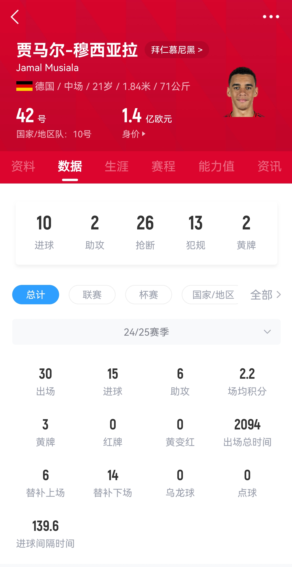 穆西亞拉現(xiàn)年21歲,德國籍攻擊型中場。他青少年時期曾在切爾西梯隊接受訓(xùn)練,2019年他轉(zhuǎn)投拜仁青訓(xùn)。2020年夏天穆西亞拉正式進入拜仁一線隊,至今已經(jīng)代表球隊出戰(zhàn)193場,貢獻58球38助。在國家隊層面,穆西亞拉已經(jīng)代表德國成年隊出戰(zhàn)38場打進7球。穆西亞拉現(xiàn)如今的德轉(zhuǎn)身價已達(dá)到1.4億歐元。
