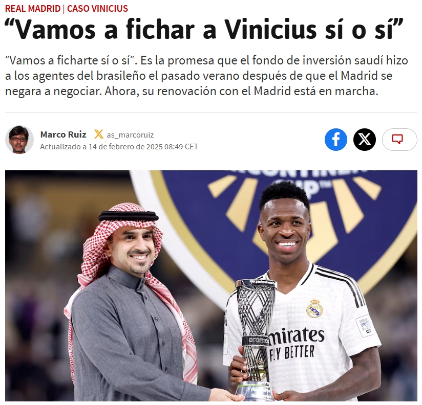 據(jù)悉,沙特方面的報價仍未正式發(fā)出,目前唯一擺在臺面上的就是他們的承諾,沙特人表示他們會在今夏為維尼修斯向開出一份約3億歐元的巨額報價,并且堅稱“無論如何我們會簽下他”(“Le ficharemos sí o sí”)。