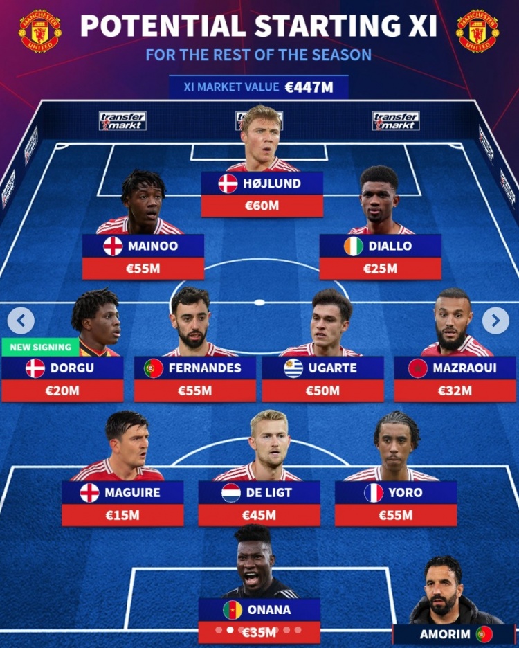 德轉(zhuǎn)預(yù)測曼聯(lián)下半程首發(fā)陣:總身價(jià)4.47億歐元
