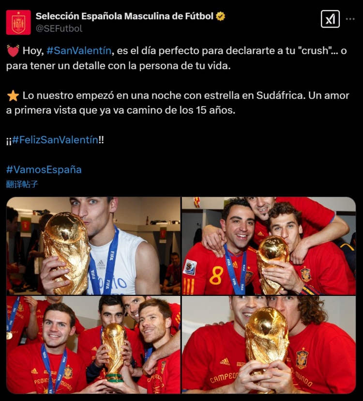 西班牙隊(duì)官推曬出了球隊(duì)贏得2010年世界杯后的照片,并配文:“今天是情人節(jié),是向你暗戀的人表白愛情的完美日子。你也可以向你生命中重要的人表達(dá)愛意。??而我們之間的愛情則始于南非的一個(gè)星光燦爛的夜晚。我們一見鐘情,至今已過去15年了?!?/p>