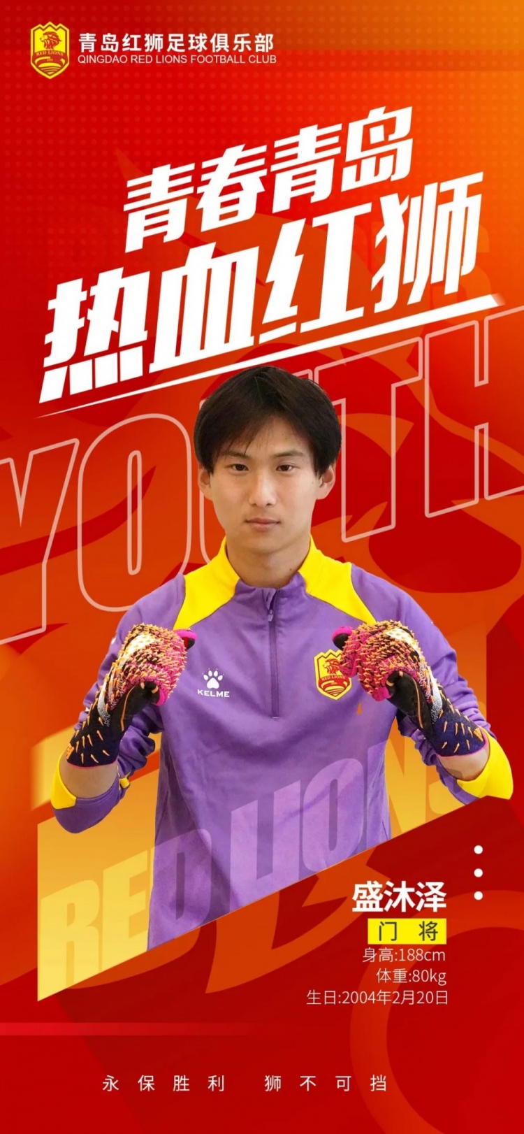盛沐澤出生于2004年2月20日,場上司職守門員。2016年進(jìn)入山東魯能足球?qū)W校接受專業(yè)訓(xùn)練,2022年代表山東泰山隊(duì)參加亞冠聯(lián)賽,2023年跟隨山東泰山U21取得聯(lián)賽冠軍,期間多次入選同年齡國家集訓(xùn)隊(duì)。