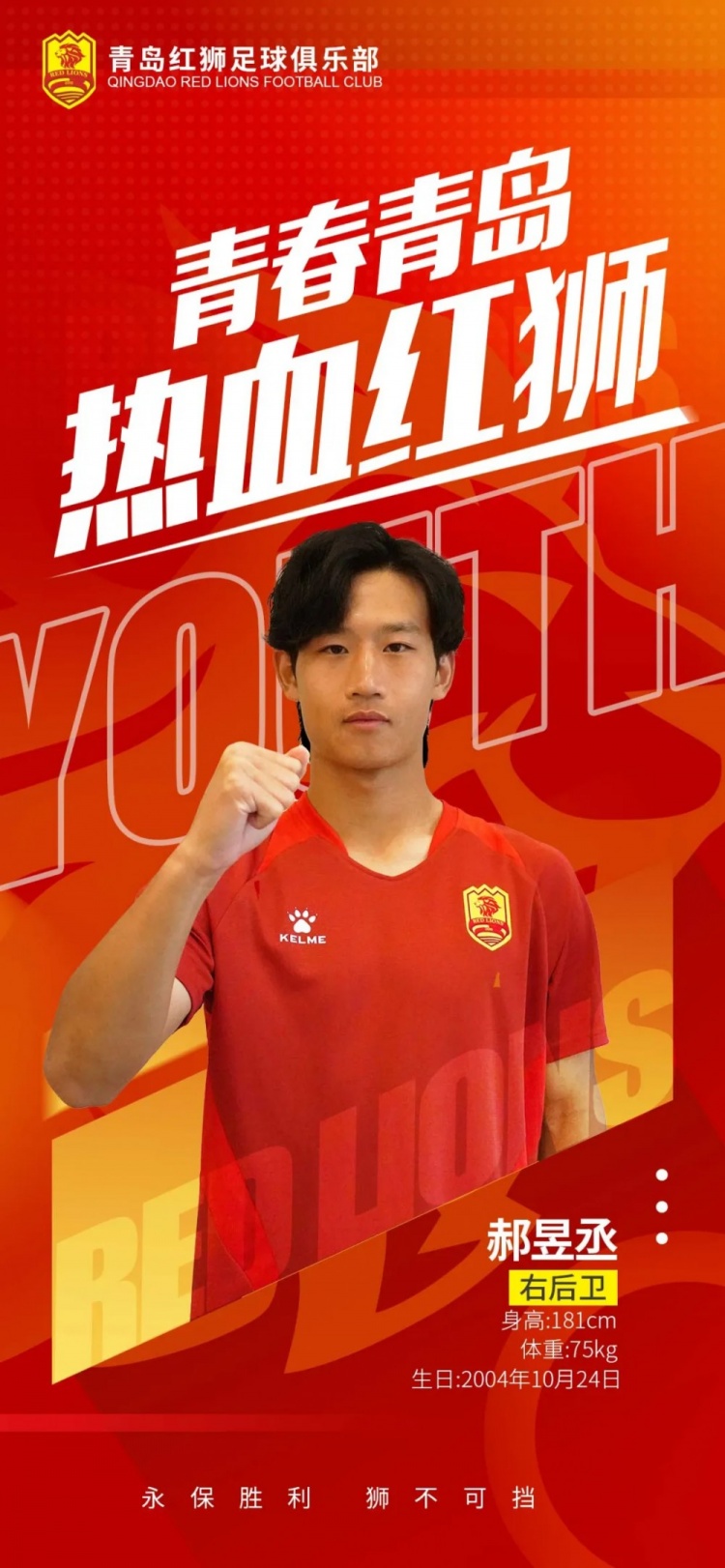 郝昱丞,北京人,出生于2004年10月24日,身高181cm,體重75kg,邊路多面手。2018年進(jìn)入北京國安梯隊(duì),2022年代表北京國安參加中國足協(xié)U21聯(lián)賽獲得冠軍,2024年入選北京國安一線隊(duì)。