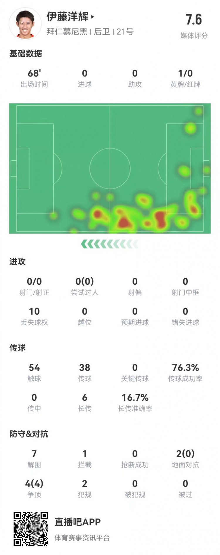 2月16日訊 拜仁在本輪德甲0-0暫時戰(zhàn)平勒沃庫森,迎來德甲首秀的新援伊藤洋輝本場數(shù)據(jù)如下: