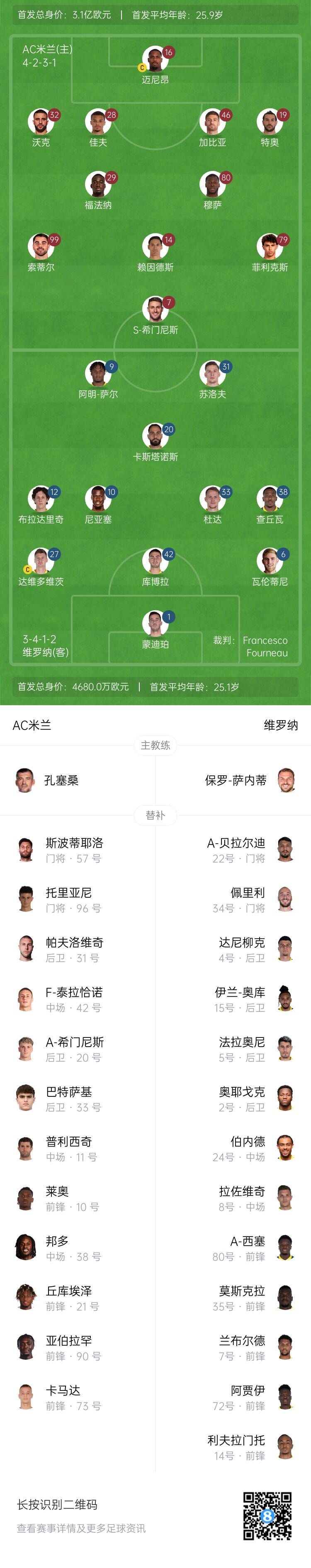 AC米蘭首發(fā):16-邁尼昂、32-沃克、28-佳夫、46-加比亞、19-特奧、80-穆薩、29-尤素夫-福法納、14-賴(lài)因德斯、99-索蒂爾、79-菲利克斯、7-圣地亞哥-希門(mén)尼斯