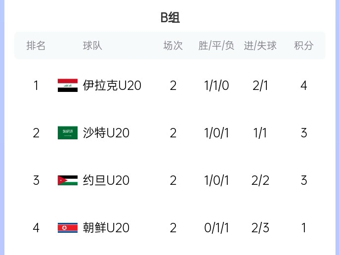 目前B組2輪過(guò)后伊拉克積4分排名第一,沙特、約旦均積3分,朝鮮積1分。末輪伊拉克將對(duì)約旦,沙特碰朝鮮。