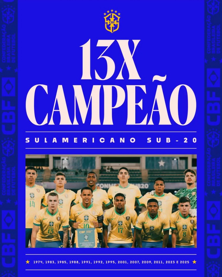 巴西隊官方社媒曬出奪冠海報,慶祝球隊第13次獲得南青賽冠軍。